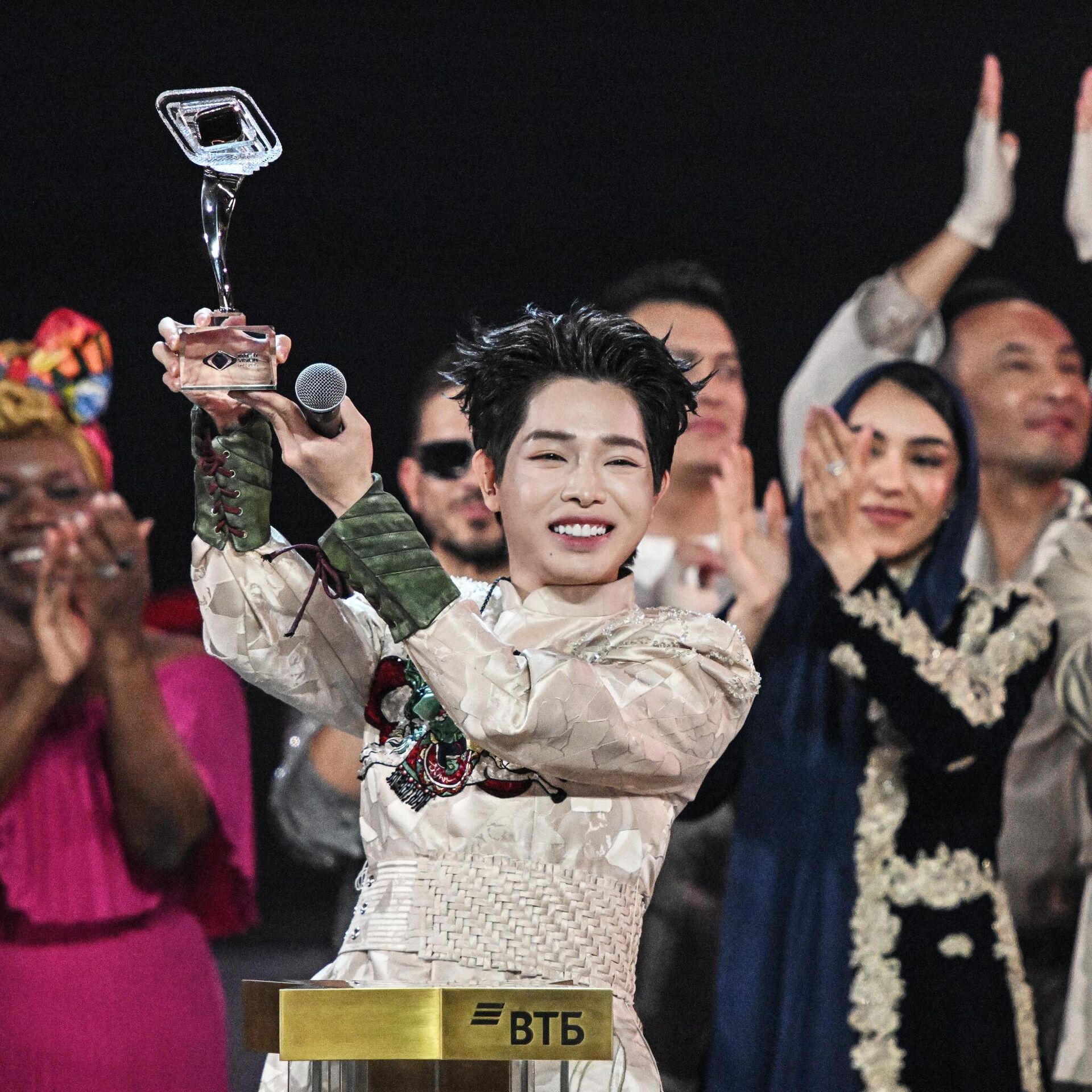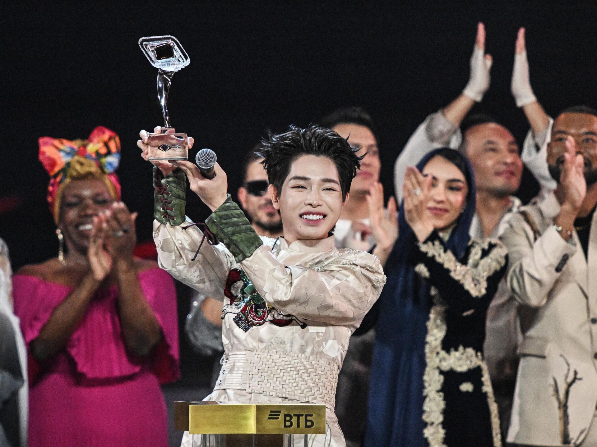 Вьетнамский исполнитель Дык Фук демонстрирует публике приз за победу в конкурсе "Интервидение"